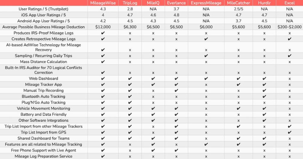 Having taken a look at what some of the industry’s best provide in terms of features – let’s take a look at a wider overview of the market, where we can see what both the most popular and best mileage tracker app providers offer: