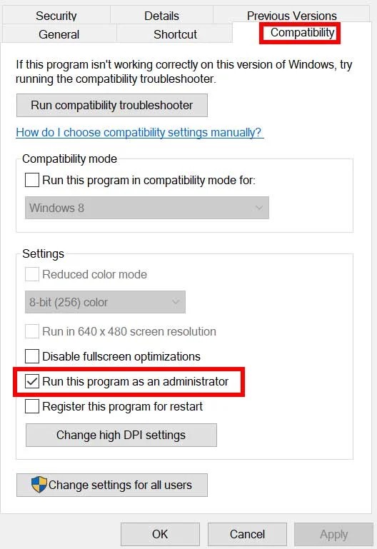4. Check the “Run this program as an administrator” box and click “Apply.”