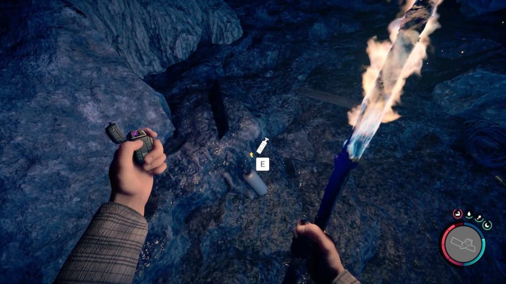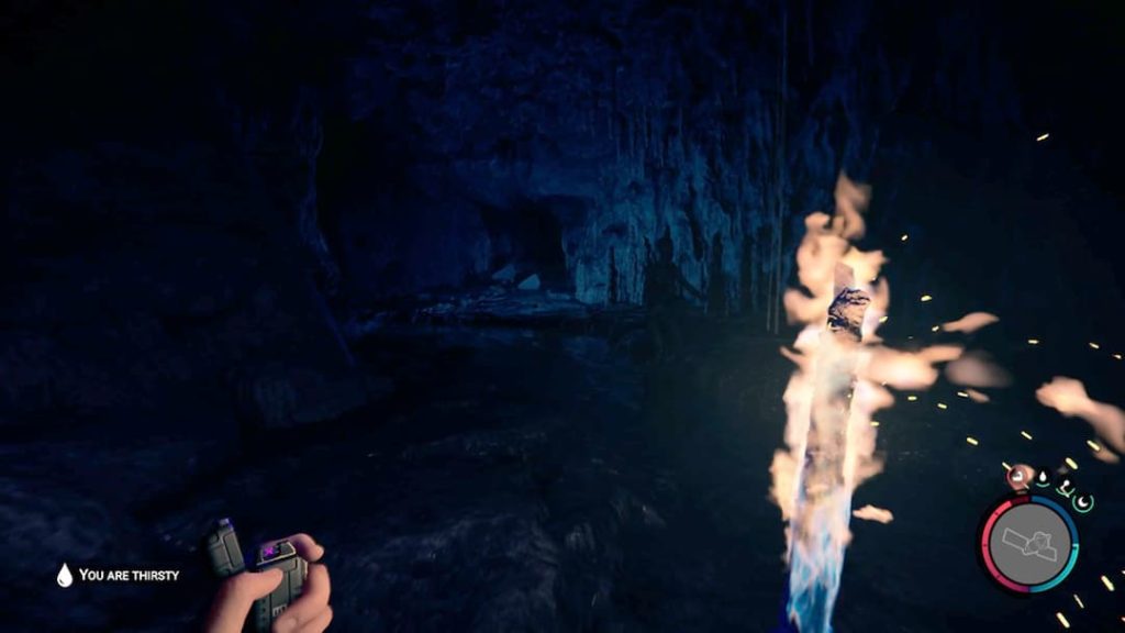 Upon entering, the interior is notably dim, except for sections illuminated by modest lights. You have the option to use your lighter by pressing L, but a flashlight would be more effective in brightening a larger space. To create a flashlight, you’ll need a piece of fabric and a stick, so it’s a good idea to locate these materials before venturing further into the cave.