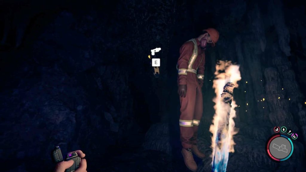 As you proceed down the right path, you’ll discover a Stun Gun on a body hanging from the cave’s ceiling at the end. Exercise caution on this route, as numerous enemies are present. Once you’ve secured the Stun Gun, you’re good to go!